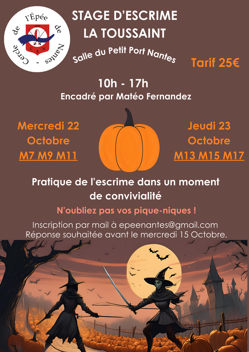 Le club organise deux journées de stage d'escrime, animé par Matéo Fernandez, lors des prochaines vacances scolaires :
